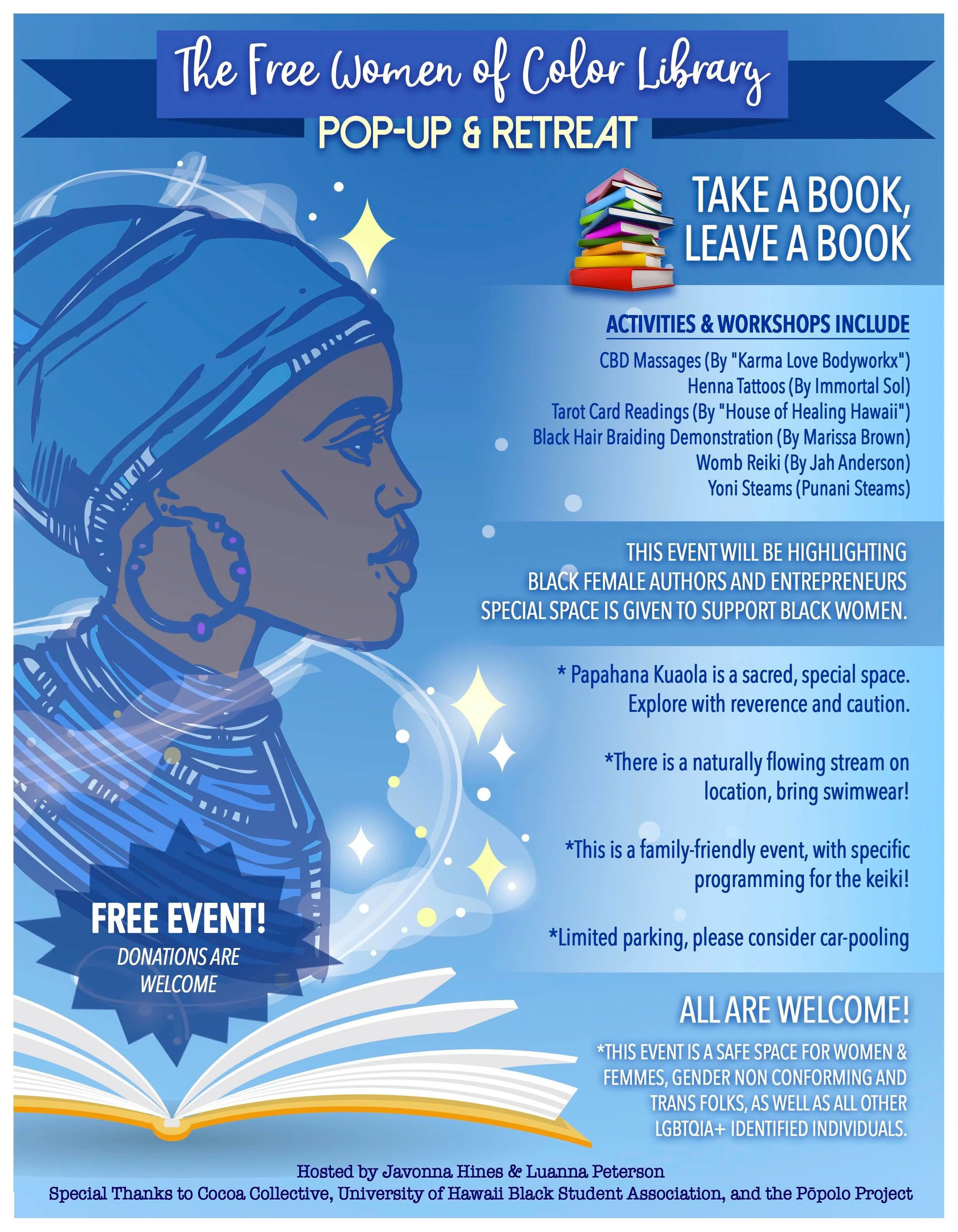 Inspired by "The Free Black Women's Library," a monthly mobile library pop-up organized by Ola Ronke in NYC, the Hawaii Free Women of Color Library Pop-Up & Retreat is an all-community book exchange and mini retreat highlighting Black and women of color authors and entrepreneurs. The book exchange is "take a book, leave a book" style, so bring a title by a Black woman or woman of color to share!